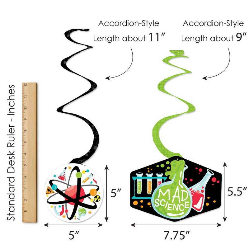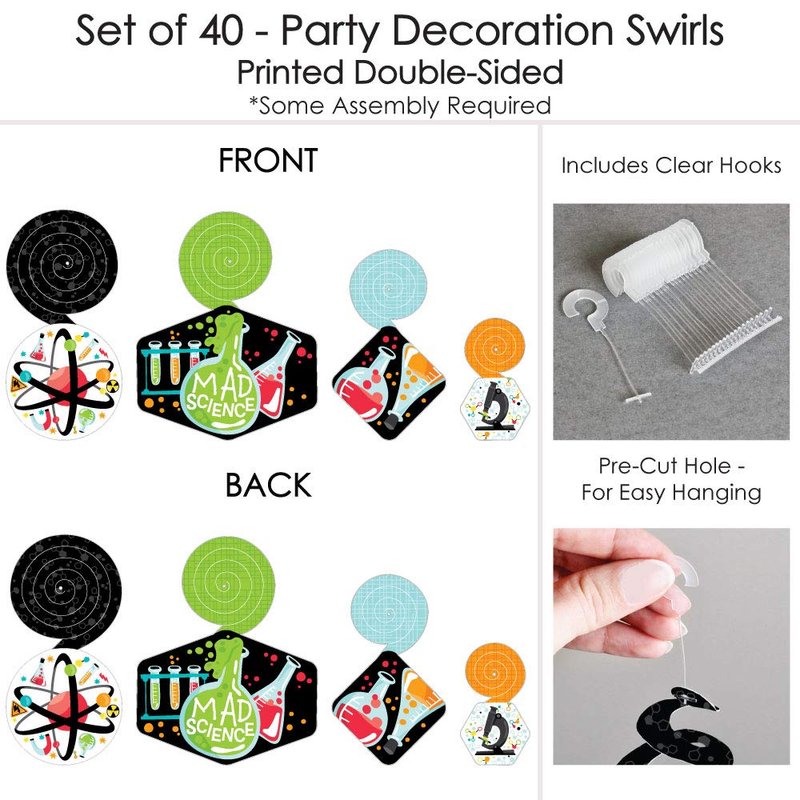 - HIGH-QUALITY PARTY SUPPLY: Scientist Lab Party Decoration Swirls are professionally printed and double-sided on heavy-duty cardstock paper. They are individually cut, inspected, and carefully packaged. Each swirl will use one clear hook.