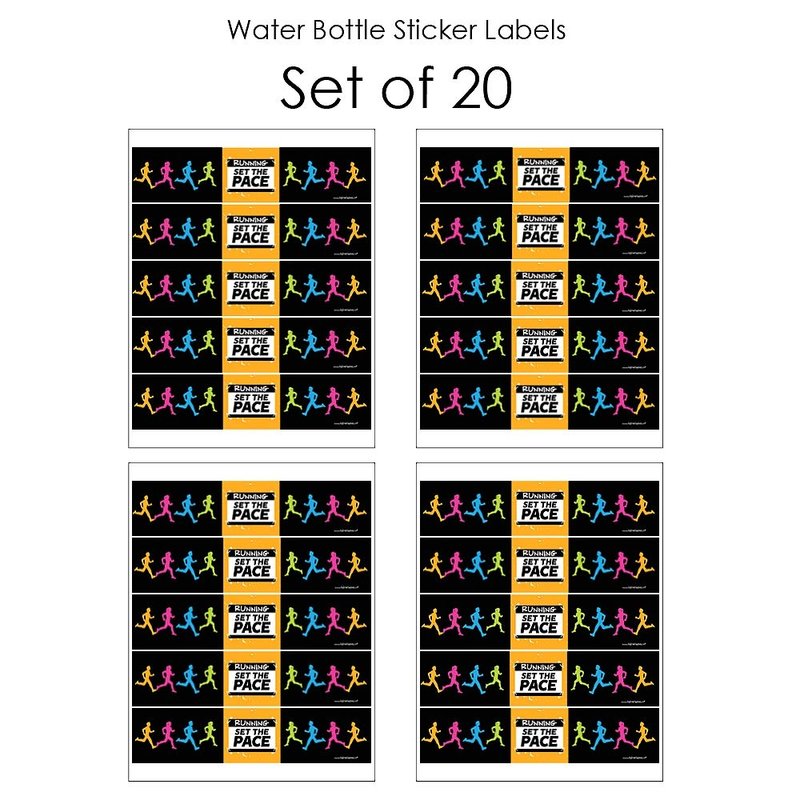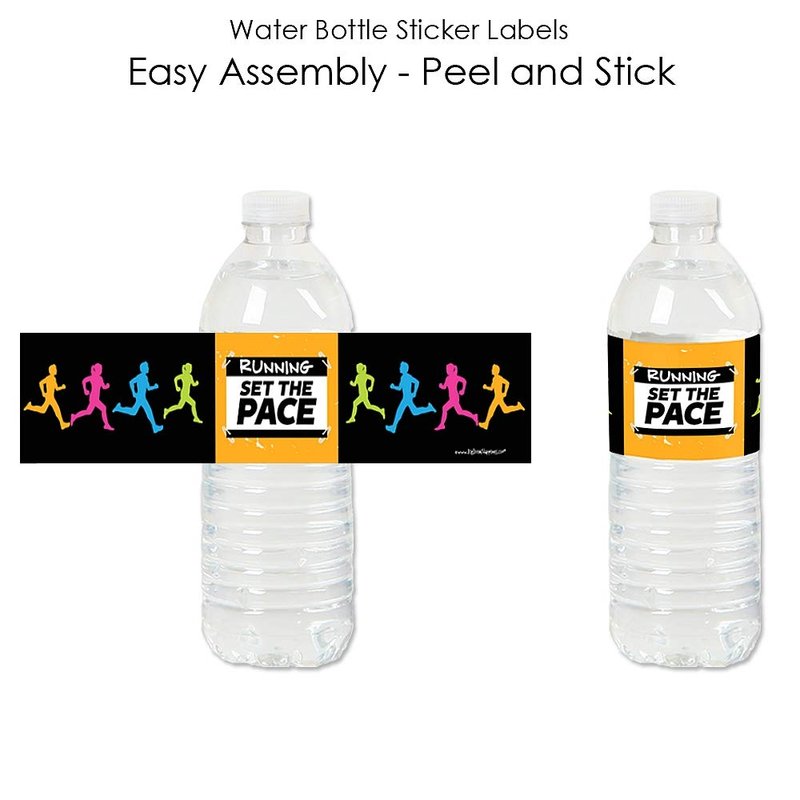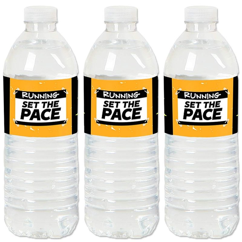 - UNIQUE BEVERAGE BAR: Set The Pace - Running Water Bottle Labels will make coordinated beverage area at your marathon party. Add Set The Pace - Running Water Bottle Labels to standard water bottles, mini water bottles, soda bottles and single-serving juice containers. Water bottle labels can also be used on cylinder containers to create 5k centerpieces.