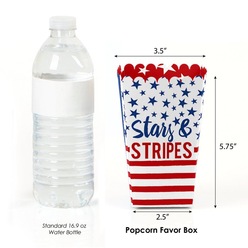 - Stars & Stripes favor popcorn treat boxes SIZE 5.75 inches tall x 3.5 inches square at the top. The unique design and large size makes these 12 red, white and blue popcorn boxes a must-have for any 4th of July, Labor Day, Memorial Day or Election party.