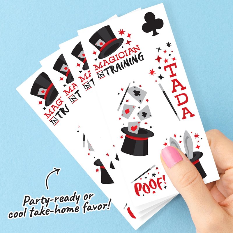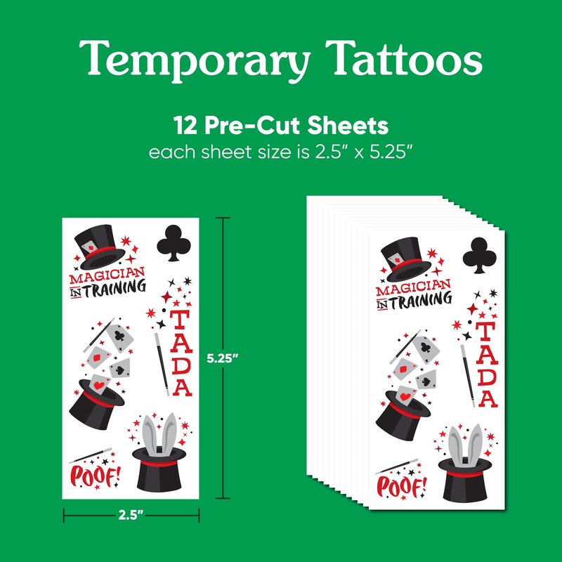- Ta-Da, Magic Show Temporary Tattoos for kids and adults INCLUDES a set of 12 tattoo sheets that make for a cool party favor addition to any Magician Birthday Party. Total of 72 tattoo designs!
