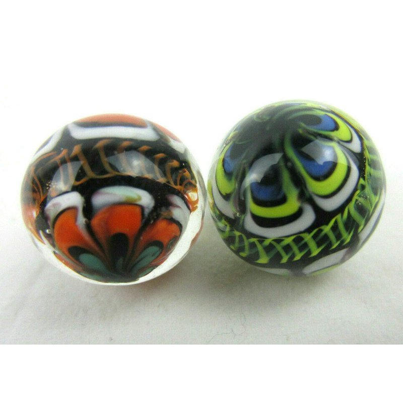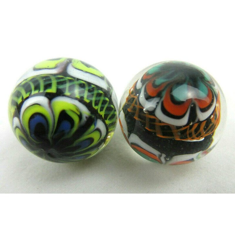 This is a lot of 2 Rinky-Dink marbles, each measuring about 16mm in size.. Each marble is handmade of solid glass with a beautiful and very intricate lattice design on them. Very unique style. This is a beautiful marble set that will be a great addition to any collection. Hand crafted marbles will exhibit a “pontil” mark where the marble was attached to the “punt” during the creative process. Each hand made marble may display a "punt" or "pontil" mark that indicates it is an individually crafted art glass marble blown freehand. This small mark is an indication of the individually crafted art glass manufacturing process, it is not a flaw or damage. Because each one is handmade, no two marbles of a given pattern will be exactly the same. Lifetime Warranty Certificate included