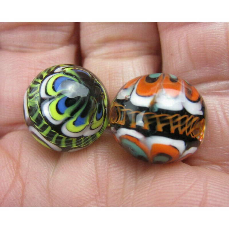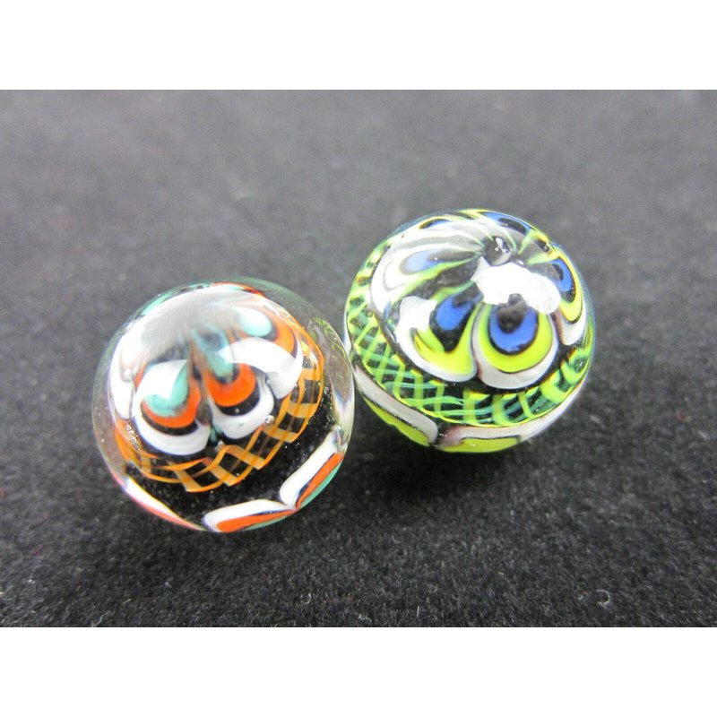 Big Game Toys ~Set of 2 RINKY-Dink 16mm Handmade Art Glass Marbles Orange Blue Green Lattice Design