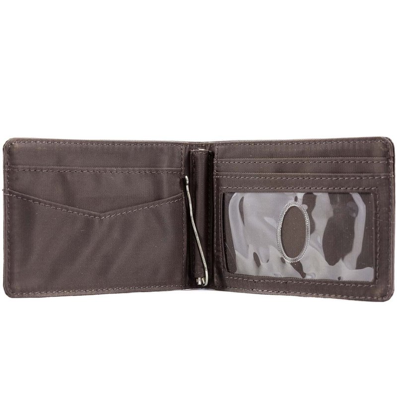 - Ultra-thin bi-fold wallet with spring-loaded metal money clip in the center; holds 20 plastic cards