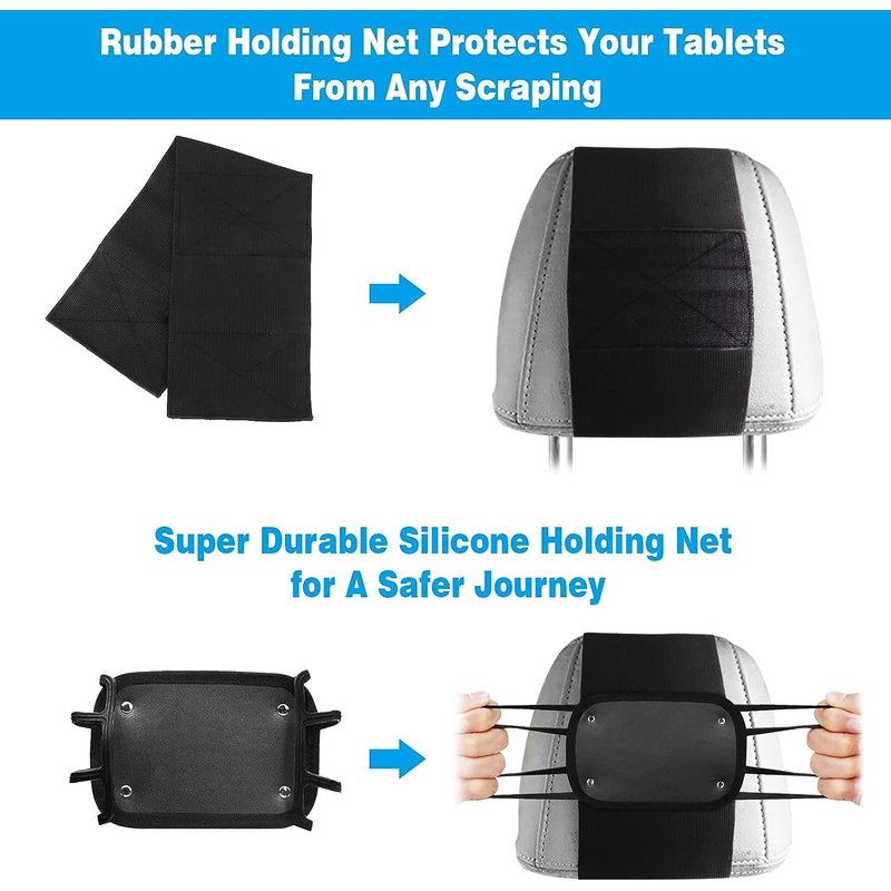 - 🚗 【Sturdy and Safe】Adjustable Tablet Holder for Car Back Seat is made of durable and safe material, elastic velcro can stick to your back seat firmly, silicone strip fixing net helps to securely hold your tablet and protect your device from scratches, and there is no need to worry about dropping the tablet while driving even on rough and bumpy road conditions.