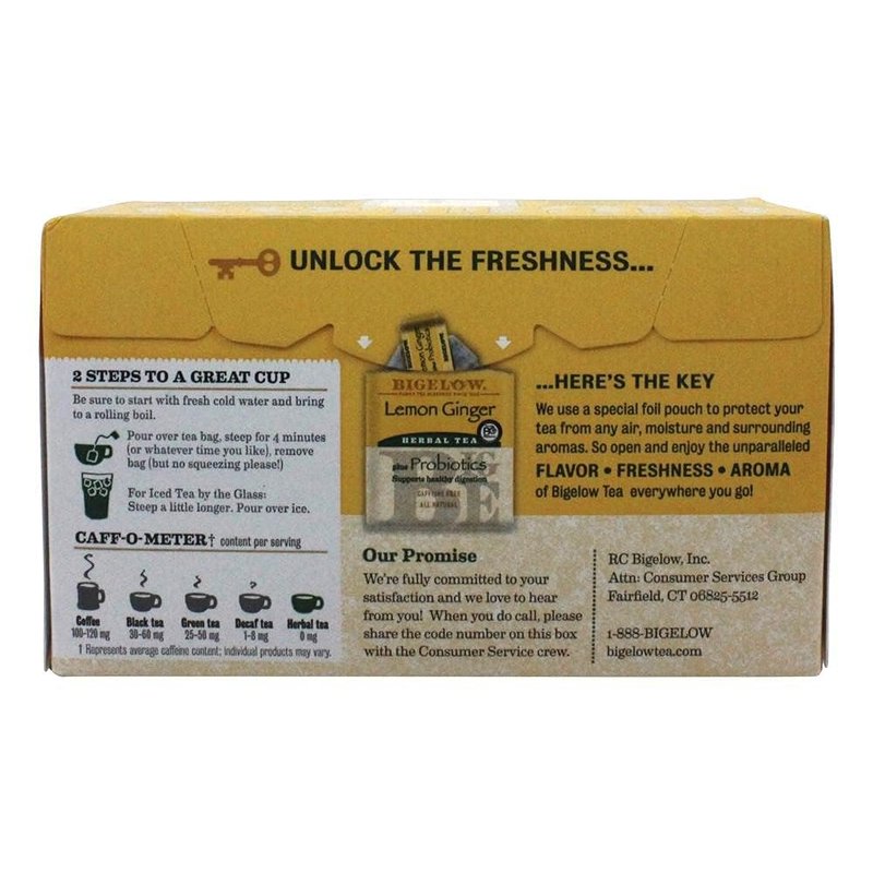 Bigelow Tea Lemon Ginger Plus Probiotics Herbal Tea Bags, 18 Count Box (Pack of 1) Caffeine Free Herbal Tea, 18 Tea Bags