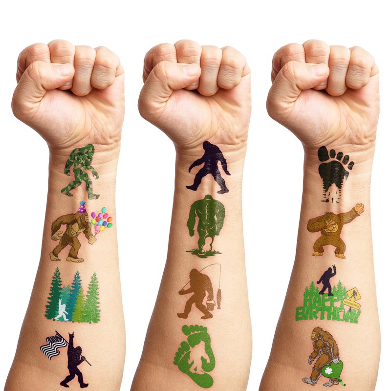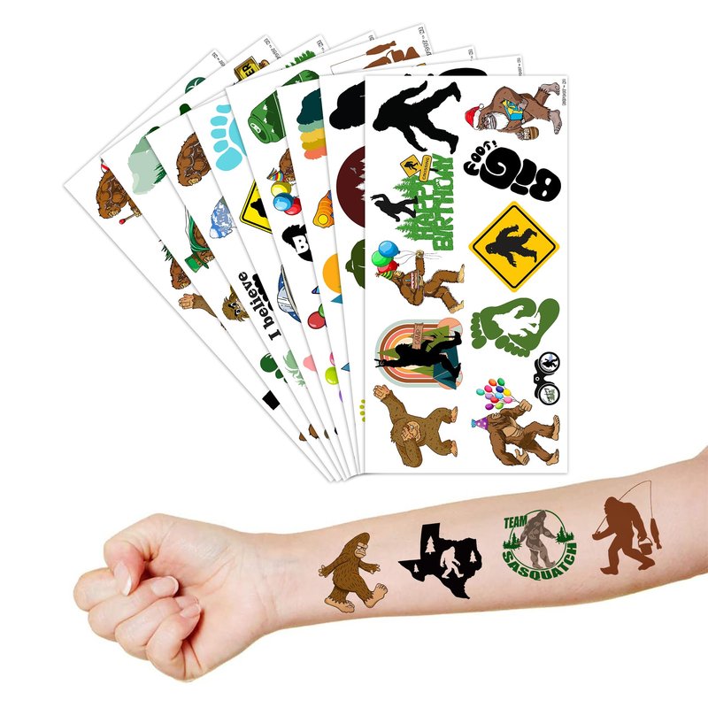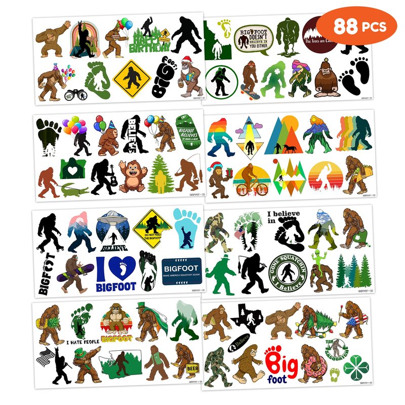 - The Perfect Cute And Funny Bigfoot Jungle Sasquatch Monster Theme Party Gift: 8 Sheets Bigfoot Jungle Sasquatch Monster tattoos stickers, each sheet measures 6.1 * 3.1 inch , one size fit all adult and kids. One of the most popular party themes for children, make the best party gifts for your children & Carnival gifts, help your children become small heroes at the party! Bring nonstop joy to the whole party! Make your kids receive full of expectation and exploration in every festival.