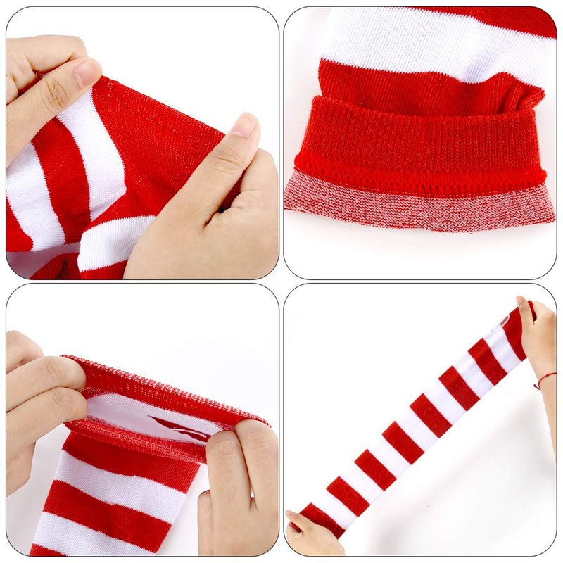 Red and White Striped Socks, 2PCS Christmas Red and White Clothes Including Striped Knee High Socks Long Arm Warmer Gloves for Adults and Teens Christmas Halloween Party Costume Package Included: 1 Pair Stripped Knee High Socks 1 Pair Long Arm Warmer Gloves Perfect Design: Our stripped socks and arm warmers are double thick and cozy to wear. Warm keeping and comfortable to wear. Premium Quality: Made of polyester (90%) and spandex (10%), elastic and good stretch, soft and breathable, can perfectly match up with your hot pant and skirt. Widely Usage: Can pair with your red and white hat for Christmas and Halloween party celebration, stage shows, comic book cosplay, Dr Seuss story, birthday parties,etc. Also suitable for cheer leaders in soccer, basketball, baseball and other sports events,etc. Features: -Color: Red, White -Material: Polyester (90%) and Spandex (10%) -Size: The stocking: 20 inches long and the foot part is 7.8 inches long The arm sleeve: 15 x 3.3 Inches