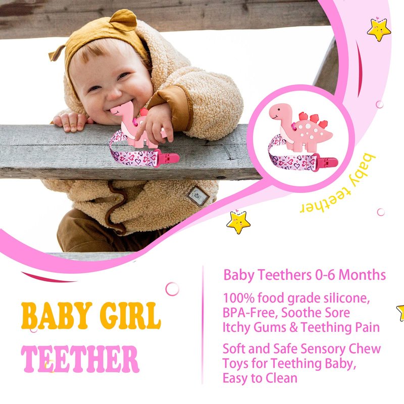 BIGSPINACH 1 Soft Dinosaur Teether for Babies and 1 Baby Pacifier Clip, Valentines Day Gifts for Baby Girl Boy,Silicone Chew Toys for Baby (Pink Elephant)