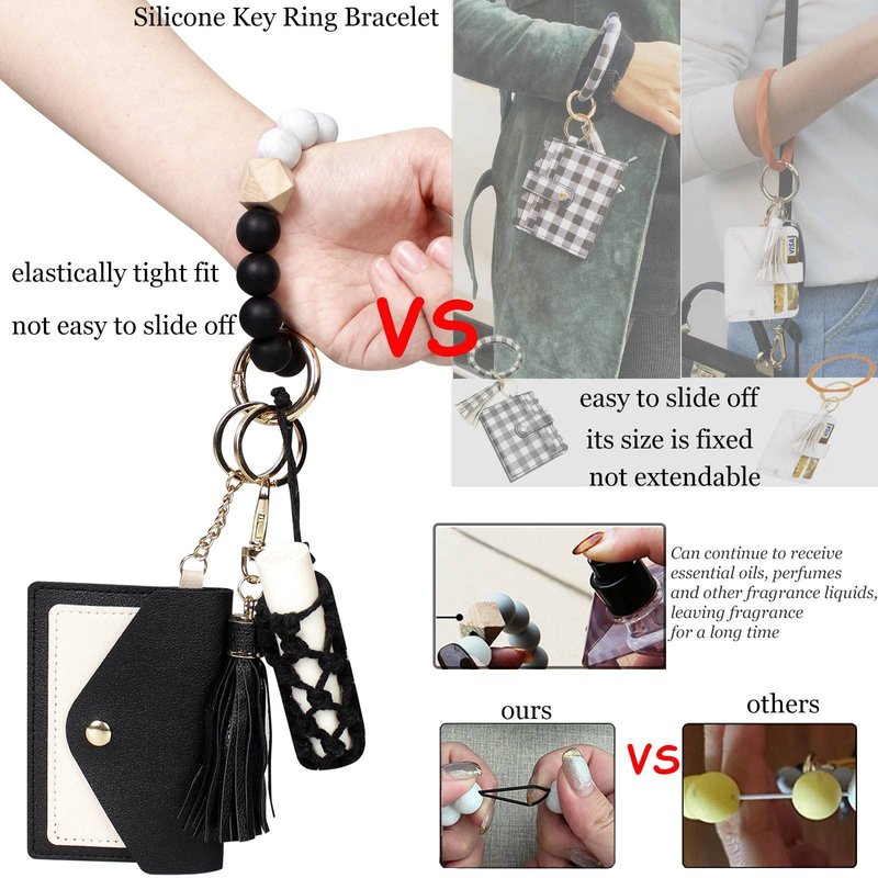 - Made Of High Quality: silicone bracelet keychain wristlet tassel is included in 14x silicone with 1x wood bead bracelet, 1x hand-knitted net lipstick holder,1x PU leather cards holder wallet, 1x PU leather tassel, 1x metal round carbine snap clip trigger, and 1x metal keychain holder.