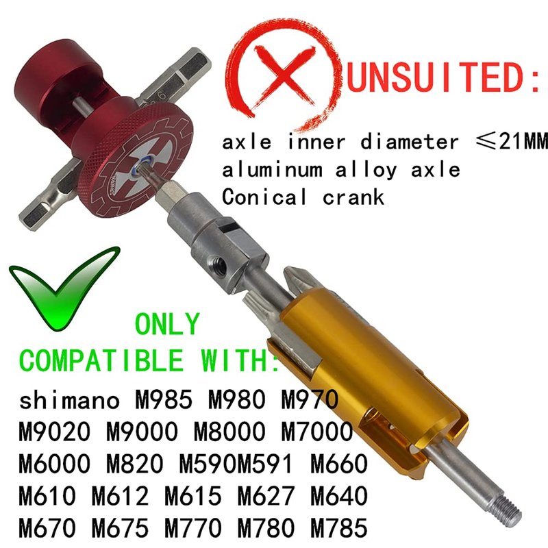 - 【UNSUITED】Bike with aluminum alloy axle & Hollow axle inner diameter ≤21MM & Crank depth <130MM & Conical crank, Please confirm the installation of this tool befor you buy it.