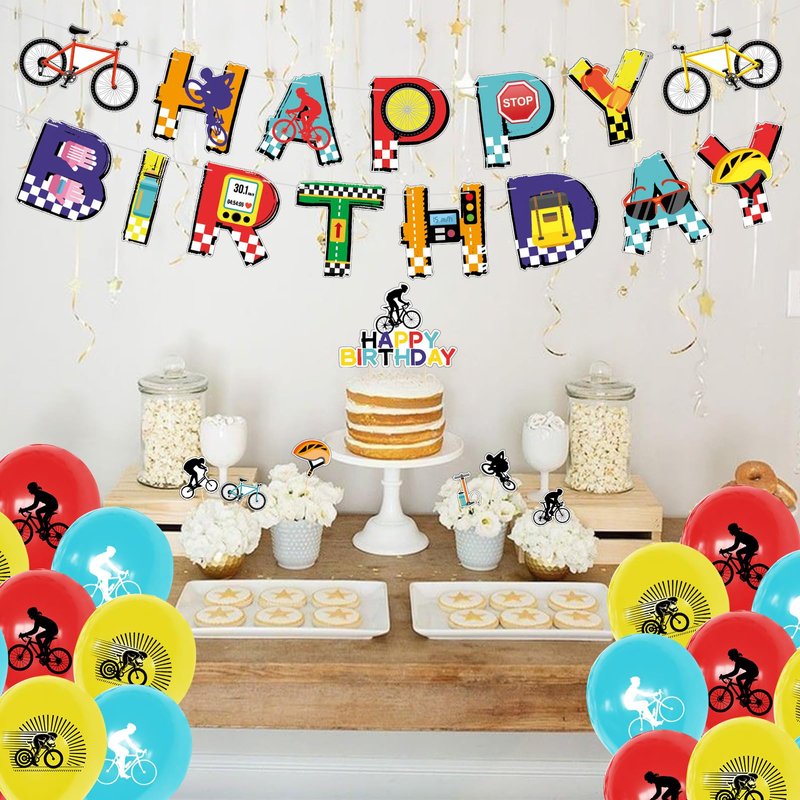 - Bike Birthday Party Decorations: Included 1 * HAPPY BIRTHDAY banner, 1 * bicycle-themed cupcakes toppers, 12 * bike-themed cupcakes toppers, 18 * latex bike balloons (6 red balloons, 6 yellow balloons, 6 light blue balloons)