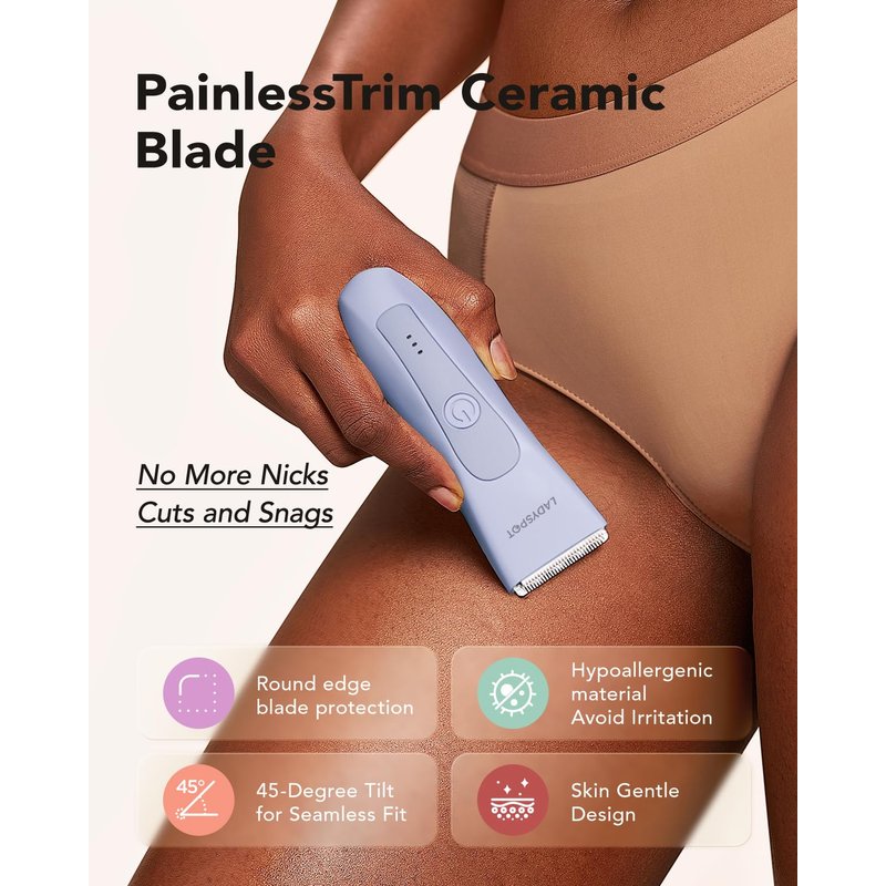- ✨ LADYSPOT Skin-Protective TECH: Help reduce nicks and cuts. This women bikini trimmer features advanced Aerospace-grade hypoallergenic ceramic blades that glide effortlessly, ensuring a silky-smooth finish without any irritation.