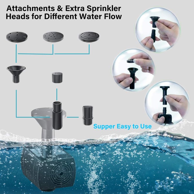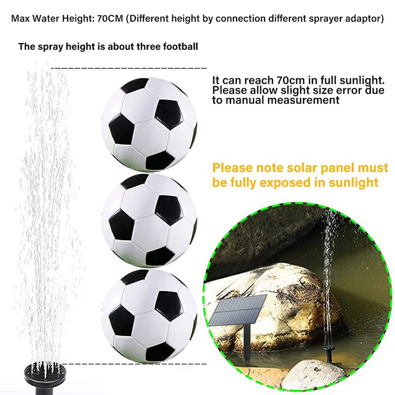 - 【4 Nozzles Solar Water Pump】4 types of spray heads for different water flow and water height. Solar water fountain pump will start working in 3 seconds once being exposed to sufficient sunlight. Solar pond fountain water up to 23.6in-27.5in, line length: 10Ft. water flow:0-160L/H. The height of water depends on the strength of the sunlight.