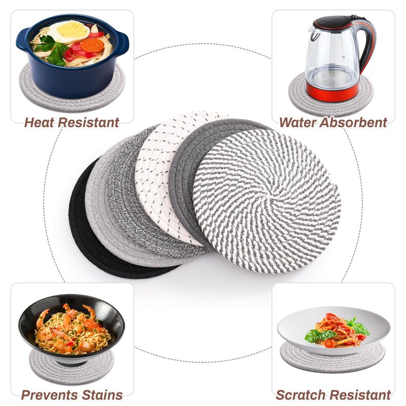 - Excellent Water Absorption - These Hot Pads are made of cotton ropes, which are super absorbent and sturdy. No worry about dishes or pans will dirty your table. Pure cotton material supports hand wash and machine wash.