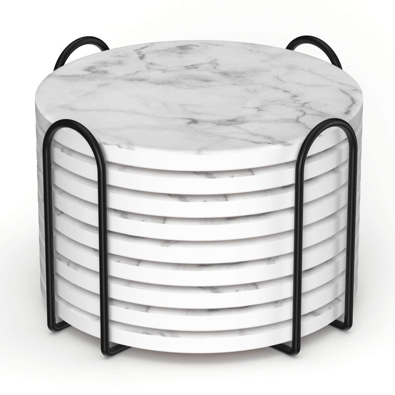 - Package including: Billbotk drink coasters set includes 9 pieces of ceramic coasters and a metal holder. Simple marble design is suitable for home, office and party decorations. The coaster holder makes the coasters convenient for storage.