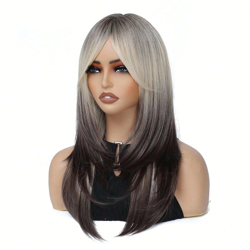 Billowig Long Layered Wigs with Dark Roots Women's Straight Wig with Bangs, Natural Lace Heat-Resistant Layered Synthetic Wigs for Daily Use (Ombre Black)