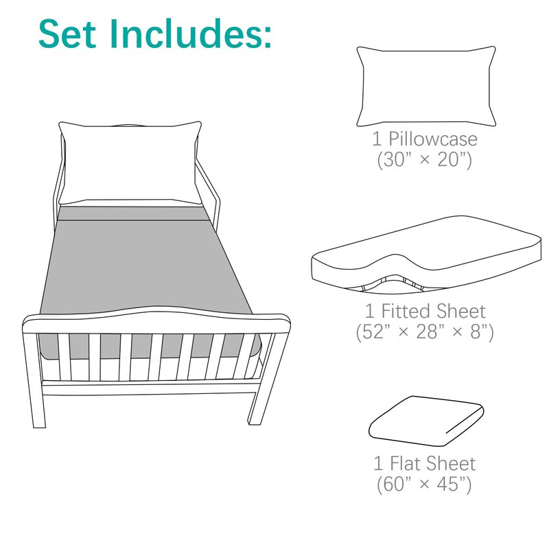 - 3 Piece Toddler Sheet Set: 1 Fitted Sheet (52’’ X 28’’ X 8’’), 1 Flat Sheet(45’’ x 60’’) and 1 Pillowcase(20’’ x 30’’). Our toddler sheet set fits toddler bed or standard crib perfectly. Encased with elastic band around 4 edges, does not slip away when baby’s sleeping over it. Super Soft and cozy texture offers toddlers and babies a good sleep and daily rest.