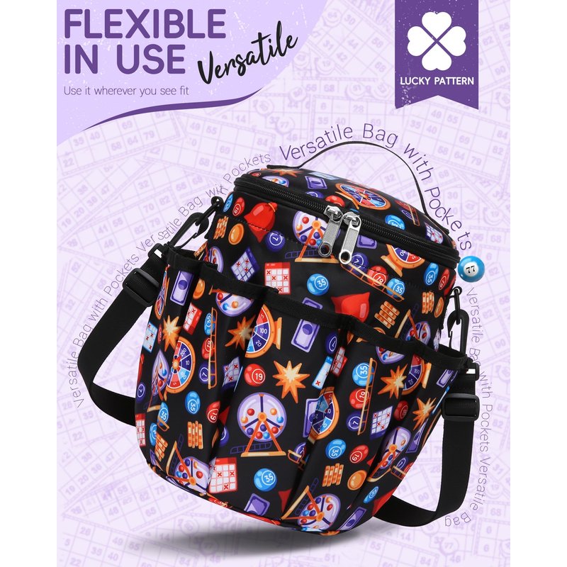 This bingo bag is 7.5"(L) x 7.5"(W) x 8.9"(H) and weighs 0.62 lbs. It has 10 exterior pockets for bingo daubers and is still roomy enough for other bingo accessories. It can be used as a handheld/shoulder/crossbody bag. Not limited to bingo, it also serves as an everyday bag or for any other purpose as needed.