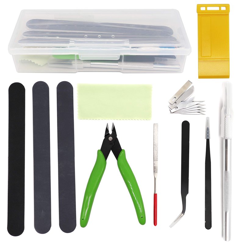 - 【What included】 1pcs * Pen knife, 1pcs * Side pliers, 2pcs * Tweezers, 1pcs * Pen, 3pcs * Polished bar, 1pcs * Parts separator, 1pcs * Spare blade, 1 x polishing cloth, 1Pcs x Manual model tools file, all above stored in one plastic storage box, for all beginner’s basic requirements;