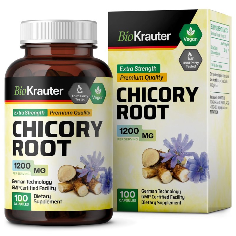 BIO KRAUTER Chicory Fiber Supplement - Chicory Root Powder 1200 mg - Inulin Capsules for Digestion Health Support - 100 Vegan Caps
