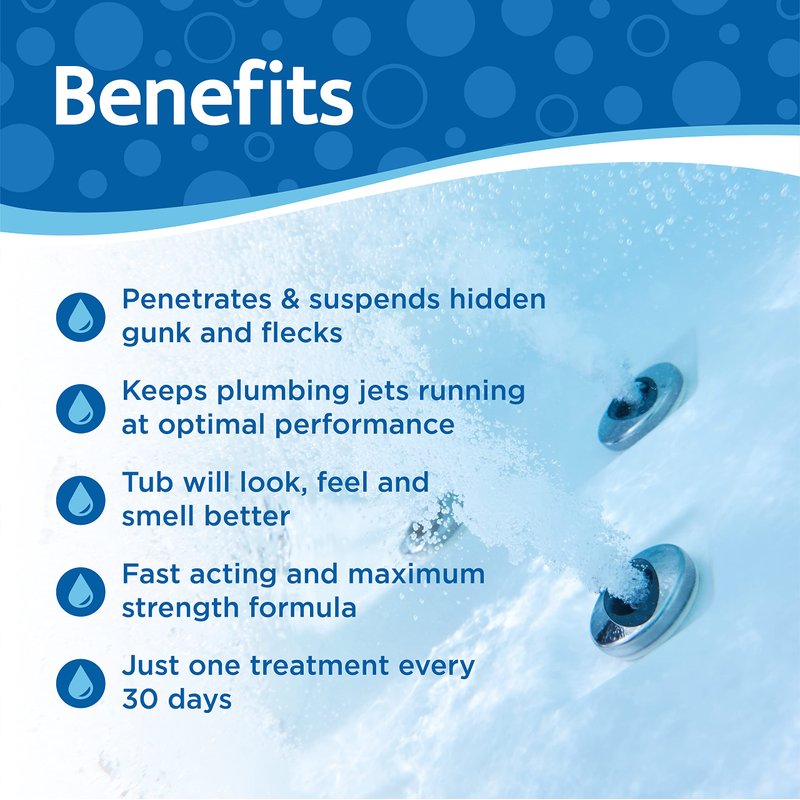 - POWER CLEAN: The powerful solution to all of your jetted tub problems. Get rid of buildup in jets and tubes with just 1 treatment every 30 days. Includes 4 packets and a microfiber towel to wipe off the gunk!