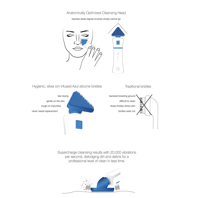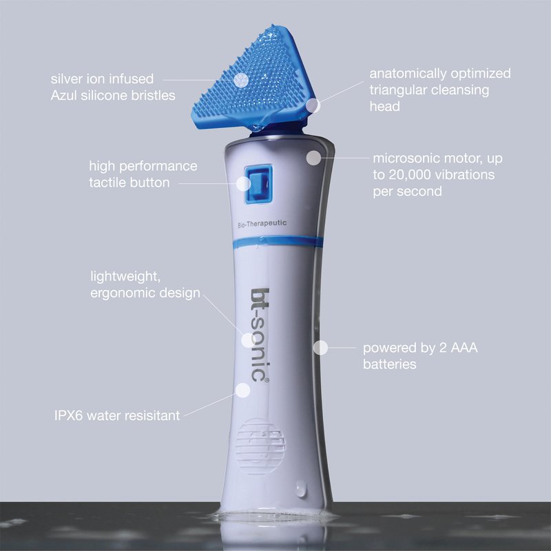 The bt-sonic is truly the only cleansing brush you will ever need, designed by the skin experts at Bio-Therapeutic. For nearly fifty years, Bio-Therapeutic has pioneered the use of advanced technology in the professional skin care industry; and the bt-sonic brings our award winning expertise to the home regimen, delivering professional grade results with every use. Anatomically optimized triangular cleansing head reaches even the hardest to reach contours of the facial landscape, delivering results in places round brushes simply can’t go. Hygienic, silver ion infused Azul silicone bristles deliver superb cleansing and exfoliating results without stressing the skin the way traditional brushes can. The ultrasonic waves pulsate at up to 20,000 vibrations per second, dislodging dirt and debris and optimizing the performance of your chosen cleanser or exfoliant. Powerful ultrasonic motor delivers optimum performance while intelligently extending battery life. Lightweight design with IPX6 water resistance makes this ideal for professional, home and on the go use. Perfect for use in the shower! Bio-Therapeutic is a minority, family owned business based in Seattle, where we design, engineer and manufacture all of our technology in our ISO 9001 / ISO 13485 certified manufacturing facility. Engineered for safety, the bt-sonic is CE safety compliant.