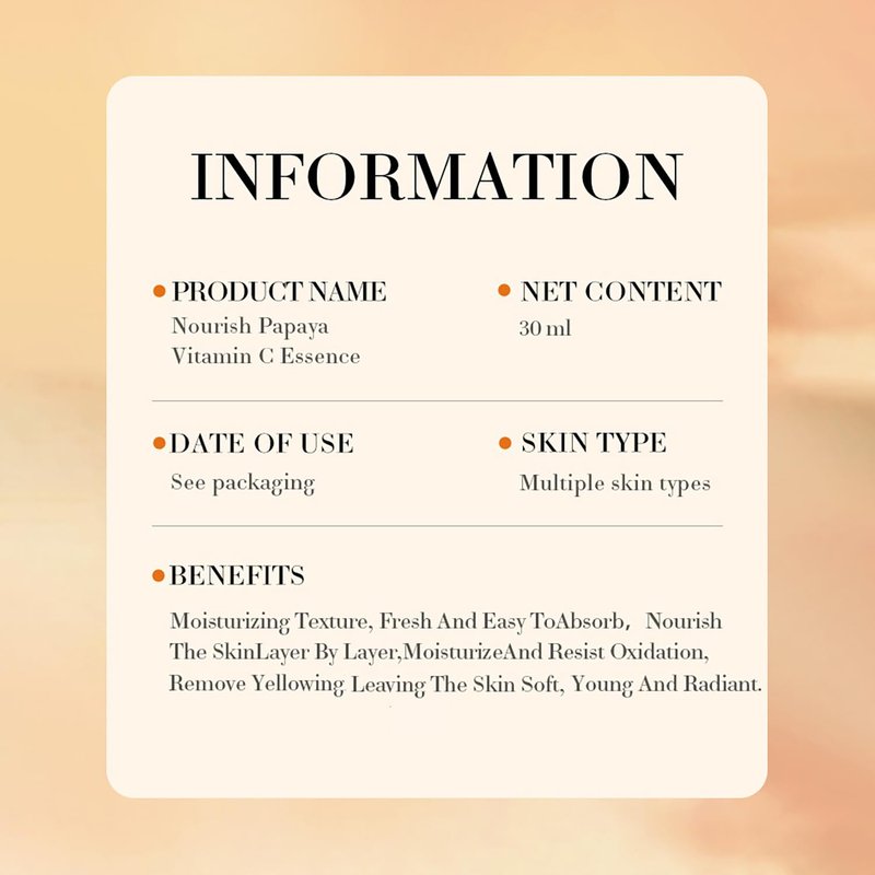- Infused with papaya enzyme, this essence has a wide range of applications that can deeply moisturize the skin, improve elasticity and firmness. Simply apply evenly on your face and neck, then massage gently until absorbed for a glowing complexion.