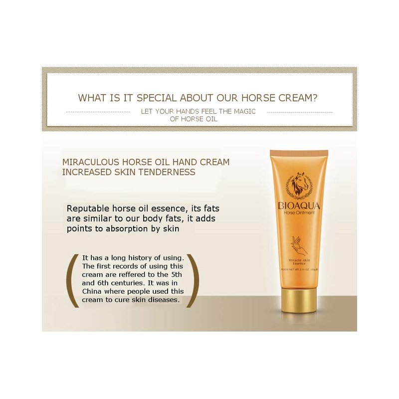 Description: Your hand is the second face. Do you pamper it? Renders beautiful skin. Make your life better with better hands. Protect the beauty of your hands. The youth of your hands depends on you don’t waste your time. Hands are like the face. They show your inner self. What is it special about our horse cream. Let your hands feel the magic of horse oil. Miraculous horse oil hand cream. Increased skin tenderness. Reputable horse oil essence, its fats are similar to our body fats, it adds points to absorption by skin. It has a long history of using. The first records of using this cream are referred to the 5th and 6th centuries. It was in China where people used this cream to cure skin diseases. Six effects for your hands protection. Remember the moments of beauty. Reveal the secrets of miracle. Extracted from healthy horses. Natural, mild and non-irritating. Supply the skin with moisture during a day. Replenishment. Emollient. Covers old lines. 4 main components for gentle nourishment: Enjoy a full luxury spa treatment. Horse oil. Nourishment and moisturizing are the main things this oil is known for. Olive oil. Contains vitamins E and A for silky and tender skin. Almond oil. Prevent dryness and provides better circulation of liquids. Glycerin. It’s easily absorbed by skin, makes skin healthier and tender. Wonderful hand cream you deserve. Yellow and dry skin, dark lines. Anti-ageing. Light and fine skin, no lines. Moisture content was 19,8%. Refills moisture. Now its level is 79,8%. Calloused awful skin. Cures diseases. Tender and soft skin. With this horse oil cream. Skin care. Silky skin. Touch of beauty.