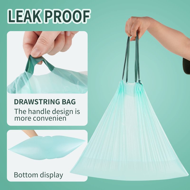 - Our biodegradable trash bags feature a drawstring design for added convenience. They are sturdy and leak-proof, making them ideal for kitchen waste, office wastebaskets and everyday household use.