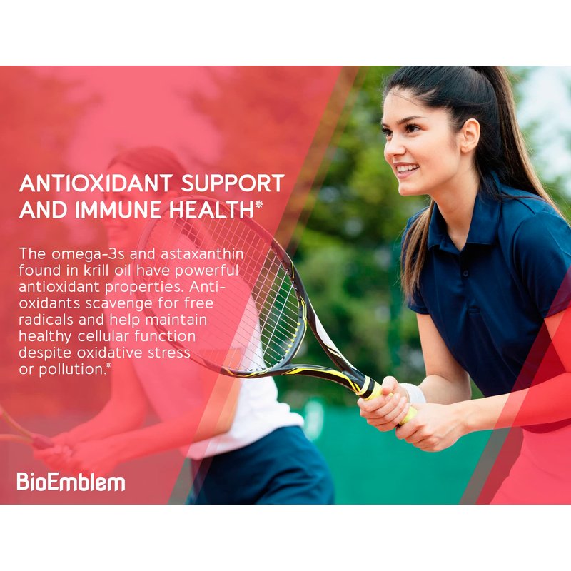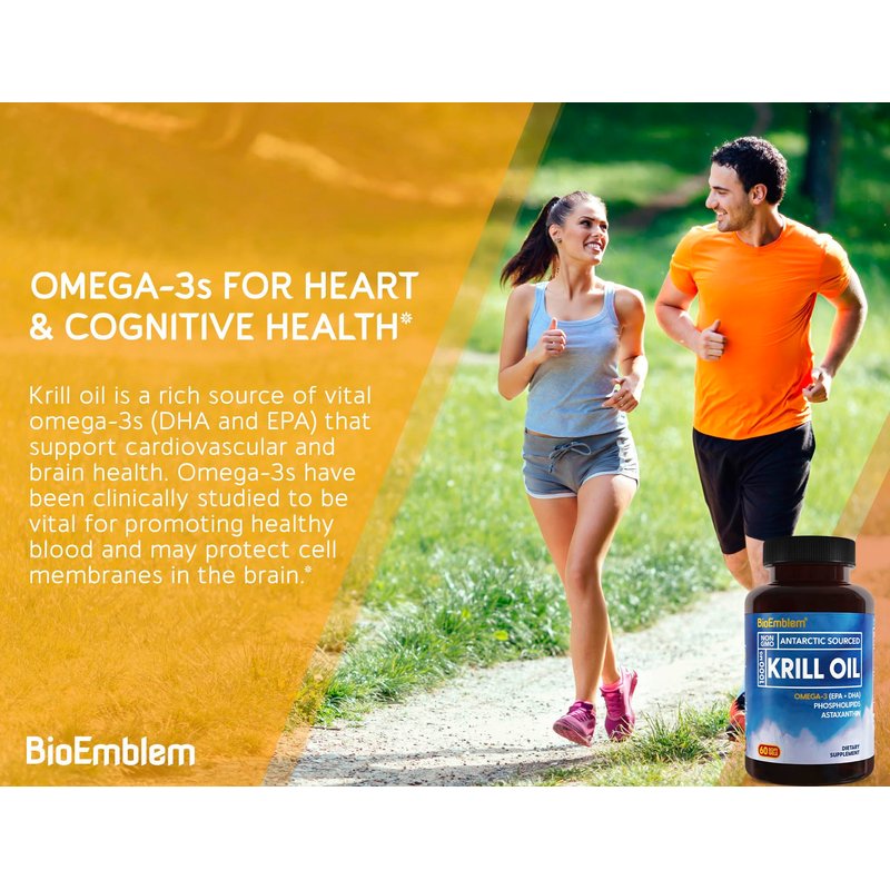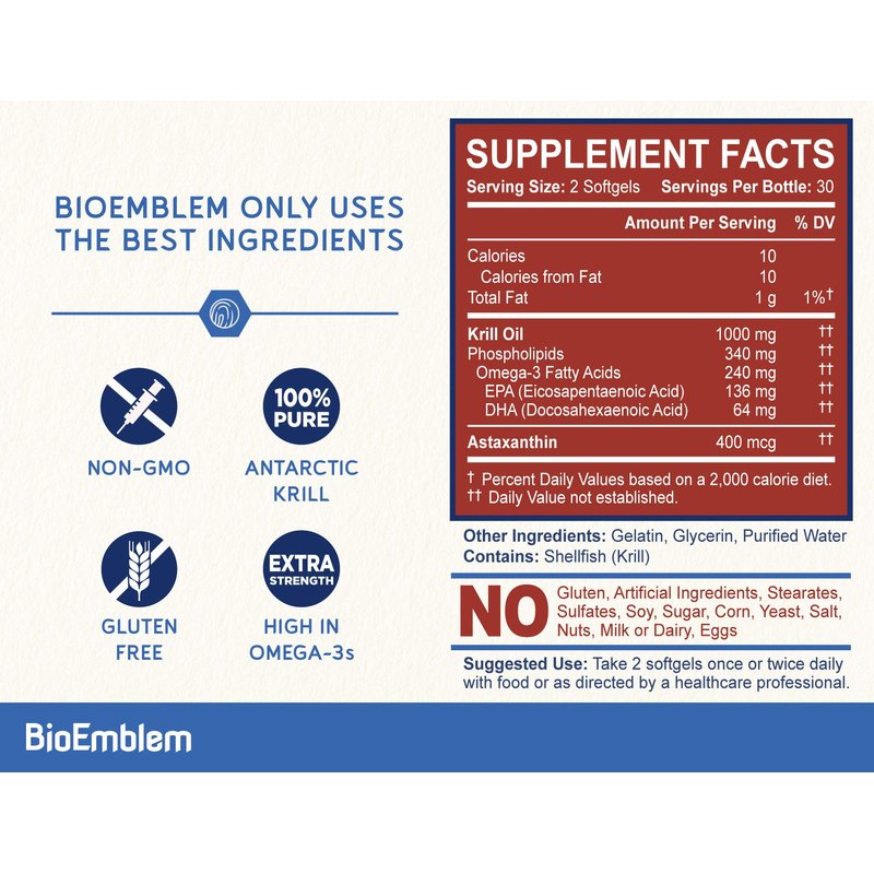 - ANTARCTIC KRILL OIL, RICH IN OMEGA-3s: BioEmblem's premium krill oil is sustainably harvested from the pristine waters of the Antarctic Ocean. Each 1000mg serving delivers 340mg of essential omega-3 fatty acids, 136mg of EPA, 64mg of DHA, along with phospholipids and astaxanthin.
