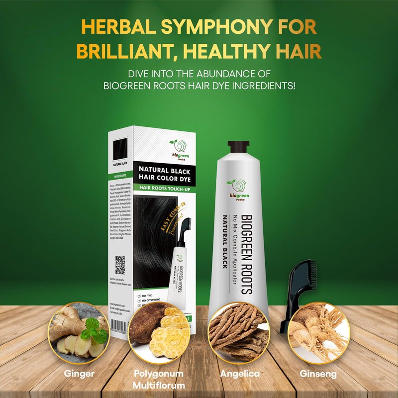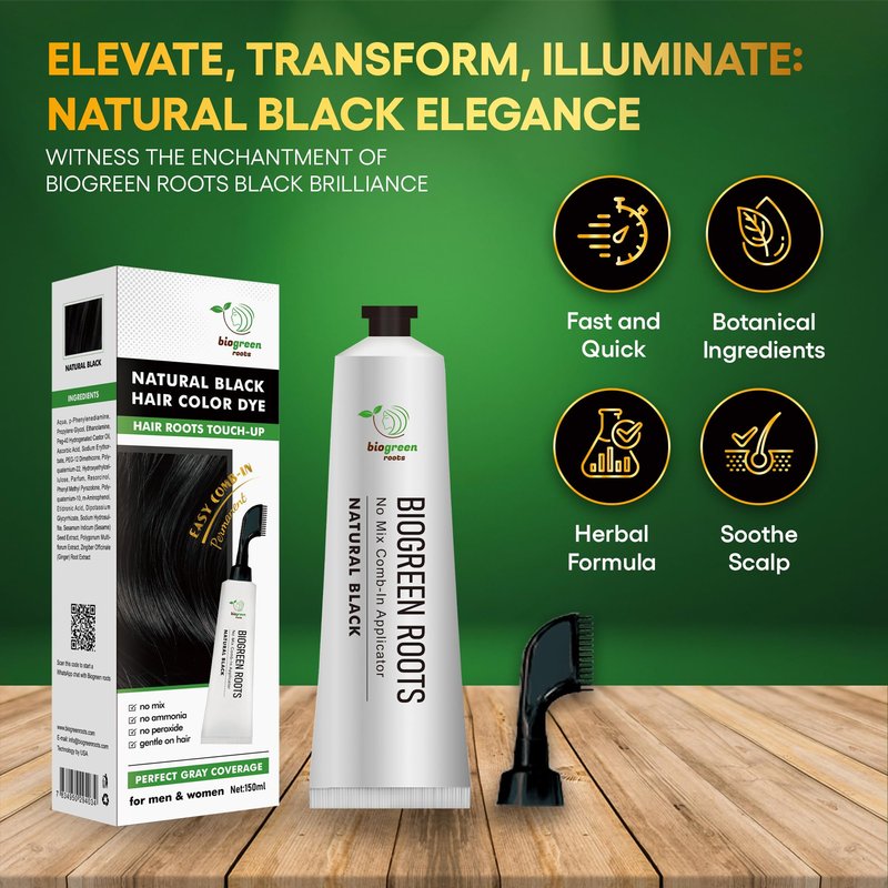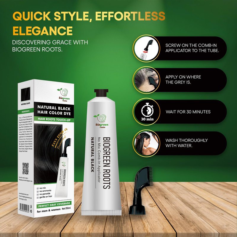 Introducing Biogreen Roots, your solution for healthier, hassle-free hair care. Say goodbye to grays and hello to vibrant, natural-looking hair with our Natural Black Hair Color Dye. Our gentle, ammonia and peroxide-free formula ensures your hair stays healthy while achieving your desired black shade. With Biogreen Roots, you can trust in a simple and effective way to revive your locks. Not only is Biogreen Roots kind to your hair, but it's also convenient to use. Our unique comb-in applicator makes the process a breeze. Just attach it to the tube, apply where needed, wait for 30 minutes, and you're done! No mess, no fuss – just stunning results. Biogreen Roots simplifies hair dyeing, bringing the salon experience to your home effortlessly. Choose from a variety of rich natural black shades, and discover the simplicity of beautiful hair color with Biogreen Roots. Take the step towards healthier, more vibrant hair today!