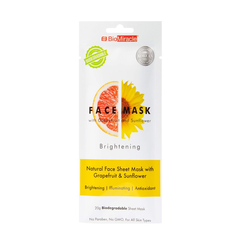 Illuminate dull skin with BioMiracle Brightening Face Mask! This hydrating sheet mask nourishes and brightens for soft and healthy skin with just one use. The sunflowers in this moisturizing face mask help to brighten skin tone and reduce the appearance of dark spots, while grapefruit clarifies skin with the refreshing, revitalizing properties of citrus. This facial sheet mask delivers powerful nutrients that work to hydrate and soften dry skin. The antioxidants in this hydrating mask also help to nurture and condition the skin. Replenish your skin with this paraben-free, non-GMO sheet mask pack!