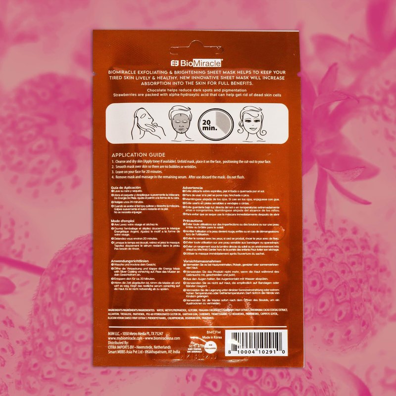 BioMiracle Exfoliating Sheet Mask helps to keep your tired skin lively and healthy. New innovative sheet mask will increase absorption into the skin for full benefits. Chocolate helps reduce dark spots and pigmentation. Strawberries are packed with alpha-hydroxylic acid that can help get rid of dead skin cells.