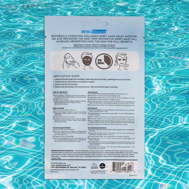 The BioMiracle Hydrating Collagen face mask is infused with watermelon and Hyaluronic Acid to help replenish your skin and provide protection against free radical damage. Powerful vitamins and antioxidants keep your skin moisturized and glowing while promoting your skin's own collagen and elastin. The new innovative design of the sheet mask increases hydration and nourishment absorption into the skin for full benefits. This mask treatment is formulated for all skin types and fits easily into every skincare routine. Instructions included on product label. Cleanse and dry skin. Unfold mask, place it on your face positioning the cut-out to your face. Smooth mask over skin so there are no bubbles or wrinkles. Leave on your face for 20 minutes. Remove mask and massage in the remaining serum. Discard the mask. Do not flush!