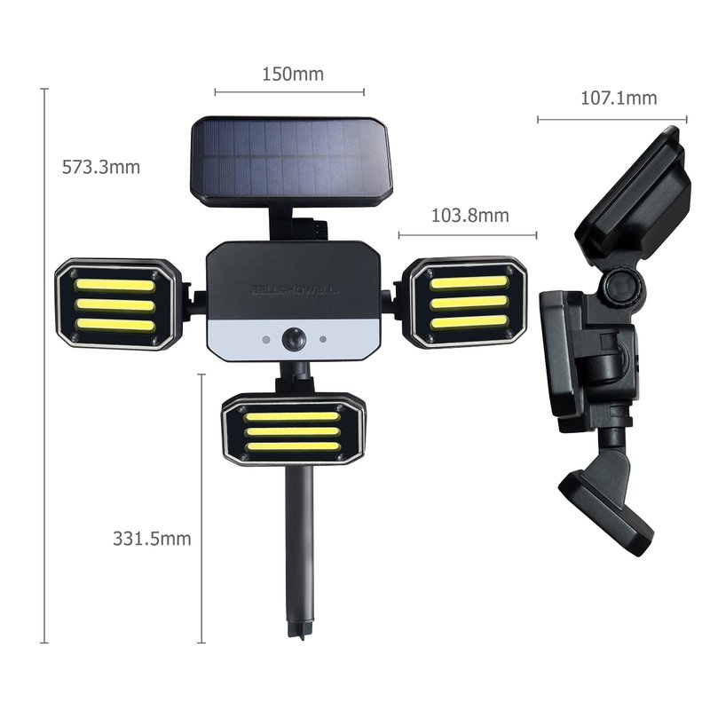 The Bionic Solar Flood Light is an all-new and innovative solar spotlight from Bell+Howell designed for American homes. Most outdoor light utilize electricity, and the wiring that comes with those outdoor security light are cumbersome and troublesome. This Sensor light and motion light from Bell + Howell uses solar energy to power up the motion sensor light at night. Unlike most solar motion light, the Bionic Floodlight comes with a remote control, making it the perfect outdoor motion sensor light. Remote has Off button, strobe and motion sensor light mode, so now you can fully operate the motion sensor light outdoor from the comfort of your own home at night. The built in accurate motion sensing technology on this motion sensor lights is accurate and detects movement from up to 30 feet away, and stops 30 seconds after motion stops or goes outside the sensor range. Versatile installation options on this fence solar lights, attach on to vertical surfaces or walls like a solar lamp or stake into the ground like an outdoor flood light. This powerful solar porch light has added SOS feature so it also functions like solar security lights. Brighten up your home with this solar motion lights outdoor from Bell+Howell and say good bye to other solar light outdoor