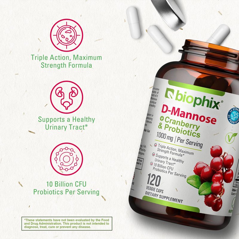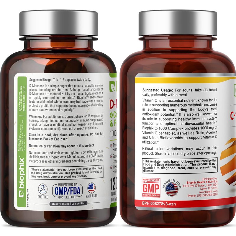 biophix D-Mannose Plus Cranberry Probiotics 1000 mg 120 Vcaps - Free Vitamin C-1000 30 Tablets - Supports Urinary Bladder Tract Health and Digestive Well Being