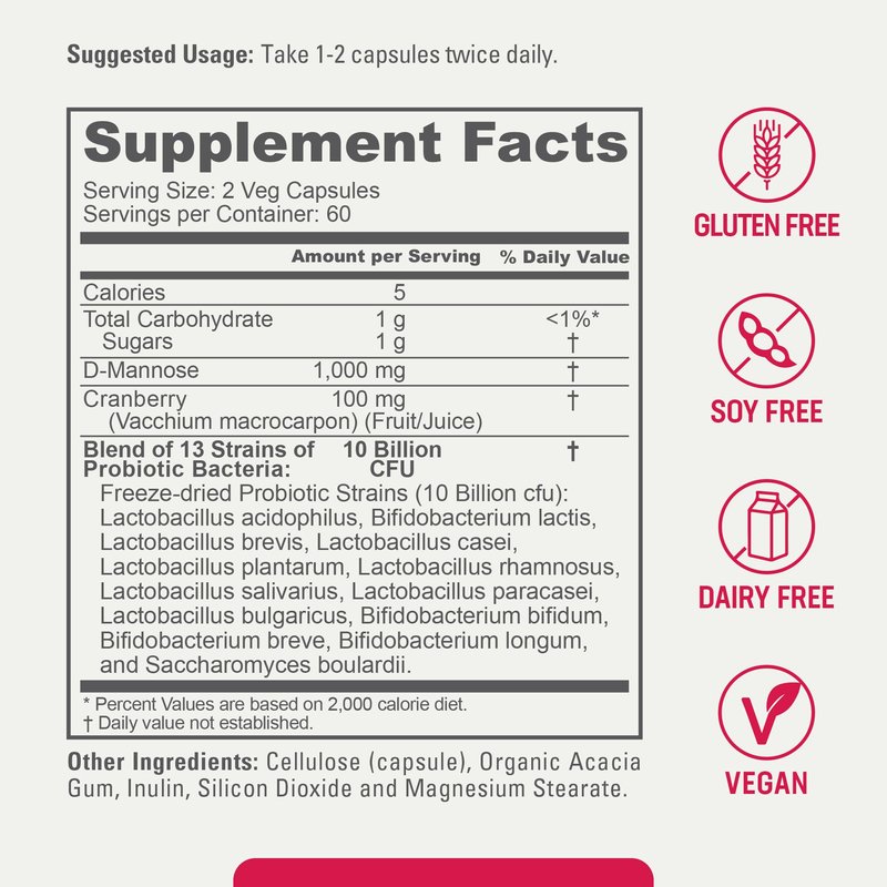 D-Mannose is a simple sugar that occurs naturally in some plants, including cranberries. Although small amounts of D-Mannose are metabolized by the human body, much of it is rapidly excreted in the urine. Biophix D-Mannose features a blend of whole cranberry fruit juice with a unique probiotic profile that supports the maintenance of a healthy urinary tract when used regularly.*