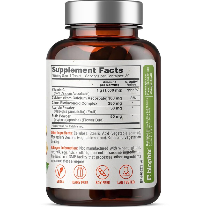 biophix Vitamin C-1000 mg 30 Tablets Complex - Vegan with Calcium Citrus Bioflavonoids Acerola Rutin - Supports Immune Health