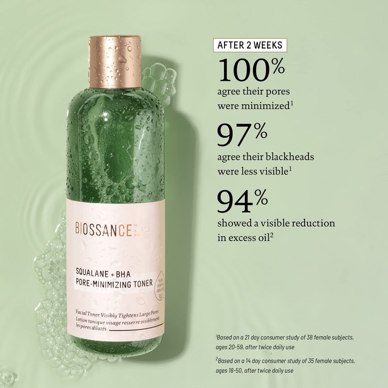 - Biossance Squalane + BHA Pore Minimizing Toner. Get clearer and smaller-looking pores without the risk of tightness or dryness. The toner mildly exfoliates to remove excess oil, dirt and debris from skin, leaving it refreshed.
