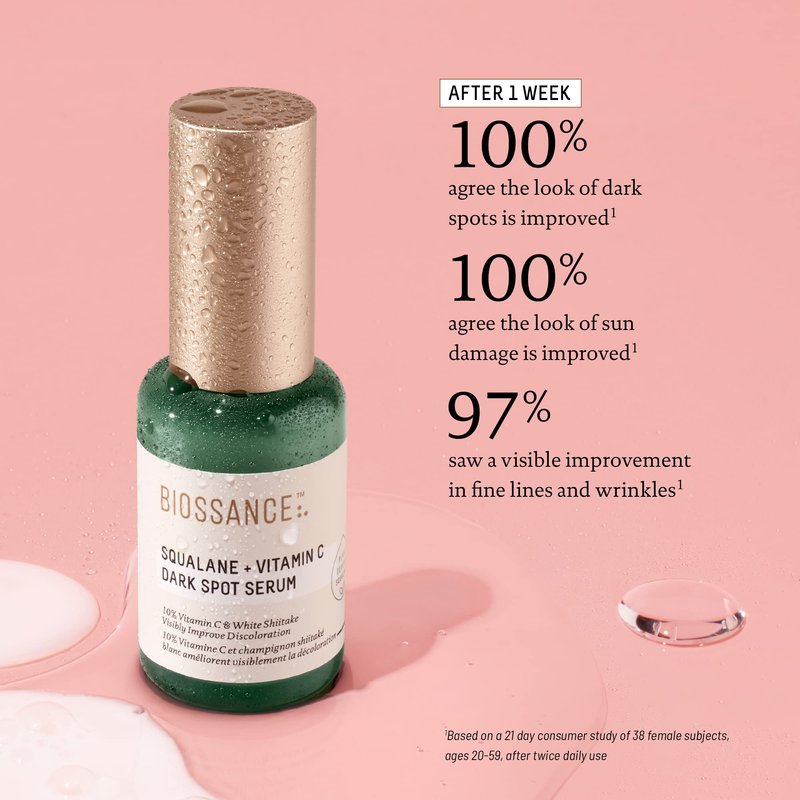 - Biossance Squalane + Vitamin C Dark Spot Serum. A targeted 10% vitamin C treatment, this serum visibly brightens instantly while working over time to dissolve pigmentation and prevent new discoloration.