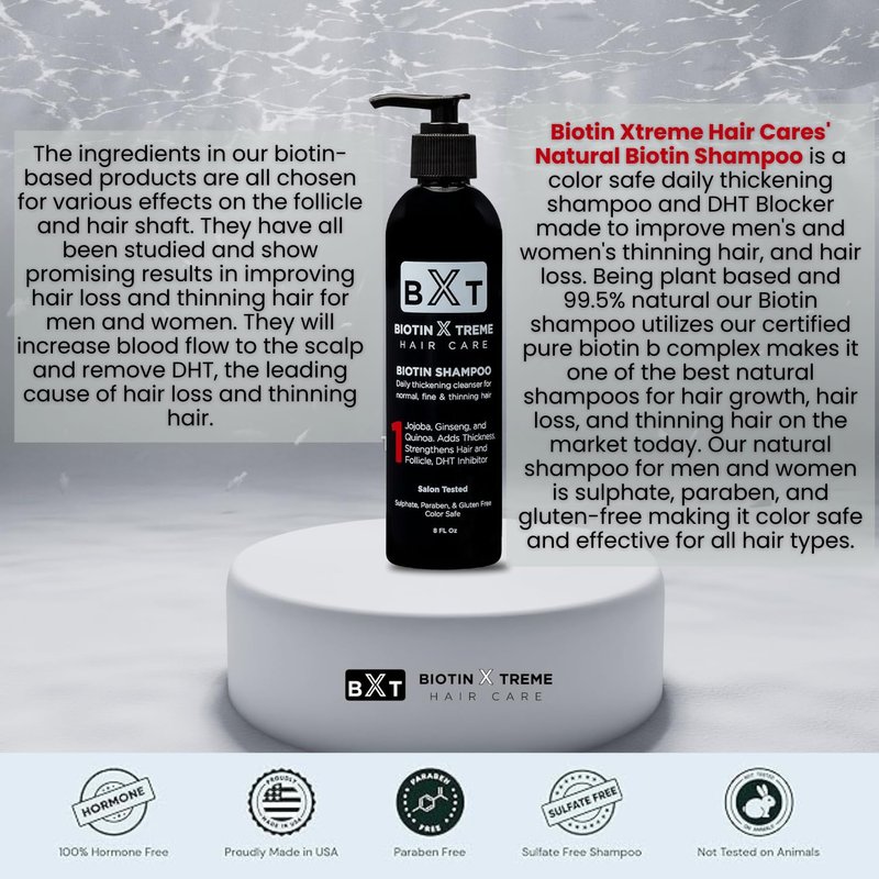 - Natural DHT Blocker: Our Biotin Xtreme Shampoo for men and women features a powerful blend of natural DHT blockers including Honeysuckle and Panax Ginseng, which help reduce the effects of DHT on hair follicles, promoting healthier, thicker hair.