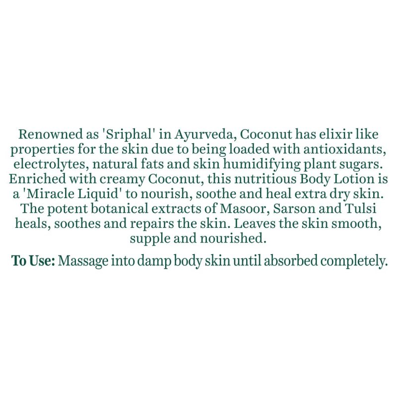 - This nutritious body lotion enriched with creamy coconut is a 'miracle liquid' to nourish, soothe and heal extra dry skin. The potent botanical extracts of masoor, sarson and tulsi heals, soothes and repairs the skin. Leaves the skin smooth, supple and nourished.
