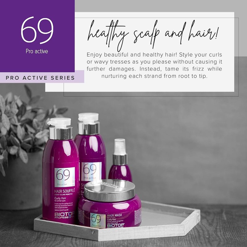 Take your curls to the next level with Biotop Professional's Pro Active 69 anti frizz shampoo for curly hair. Its gentle formula helps to tame frizzy hair and define the natural texture of your waves and curls. Formulated with almond oil for hair, coconut oil for hair and avocado oil for hair to add bounce, definition and shine after just one use. Our detangling shampoo helps to make your curl patterns more defined and moisturized, revealing soft, shiny hair. Unlike ordinary curly hair products, this curly hair shampoo is color-safe, keeping your hair color in tact. Amplify your hair shine by applying 2-3 pumps of our curly hair care and massage from root to end. To get the best results from this moisturizing shampoo, a second wash is recommended. This product is perfect if you have wavy, curly or naturally textured hair. Our professional shampoo is a one-stop-shop to activate and enhance your hair's natural texture. At Biotop Professional, we create a range of products such as hair frizz control products, moisturizing hair products, curl enhancing hair products and so much more.