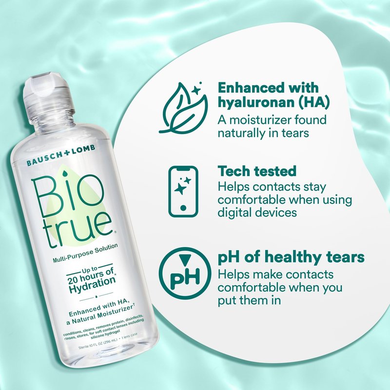- NATURALLY INSPIRED FEATURES: Inspired by the biology of the eye, Biotrue contact lens solution contains hyaluronan (HA), a moisturizer found naturally in tears; and matches the pH of healthy tears to help make contacts comfortable when you put them in.