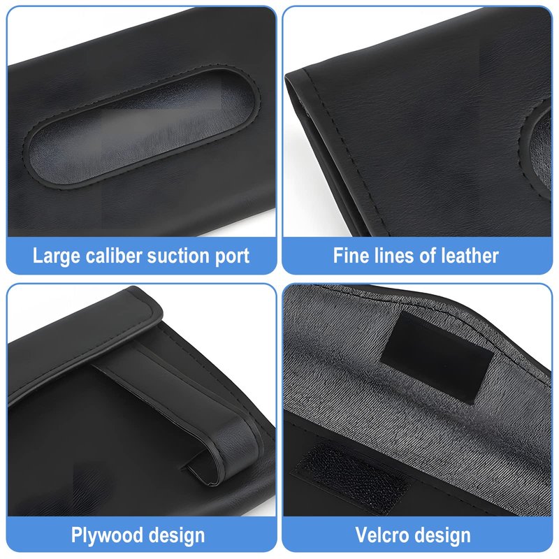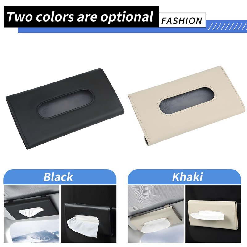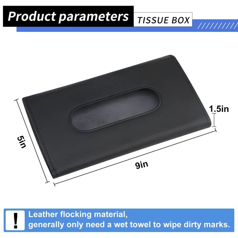 Product Name: Car Tissue Holder Material: PU Leather Texture: Soft and Delicate Color: Black Product Size: 9*5*1.5in Weight: 0.16kg Back: Memory Metal Clip Appearance: Stylish and Simple Interior: Smooth Velvet Magic Tape Design: Easy to Install Craftsmanship: Exquisite Stitching Convenient Installation Includes Tissue Pack