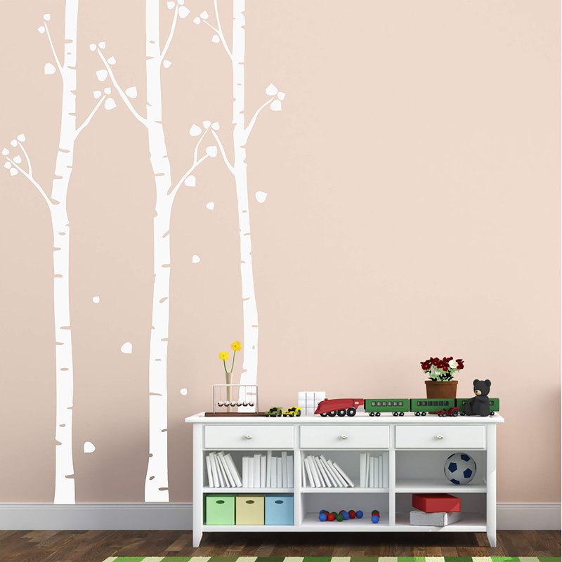 Birch Tree Wall Decal Nursery Set Woodland Vinyl Sticker Removable Branches Art Leaves (3 Trees) #1505 (72" (6ft) Tall, Matte White)