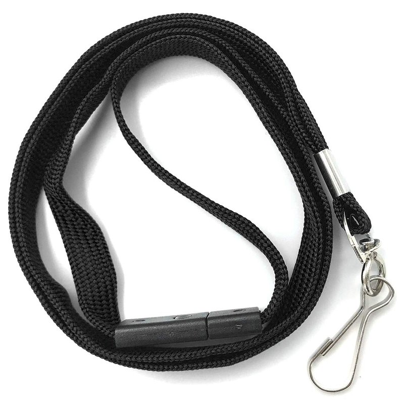 - Bulk Black Breakaway lanyard J-Hook width: 3/8" (Shoe String Style)