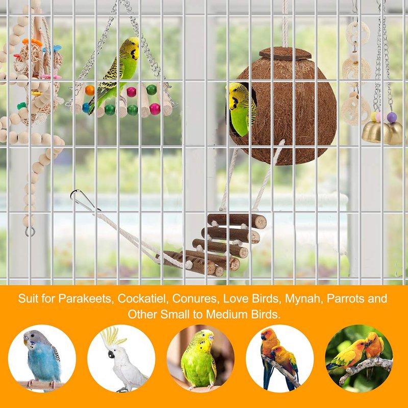 Bird Parakeet Toy Bird Cage Hammock Bird Perch Natural Coconut Hideaway with Ladder Swing Chewing Hanging Bell Toy with Mirror for Parrots,Parakeet,Conure,Cockatiel,Budgerigar,Love Birds,Mynah,Finches