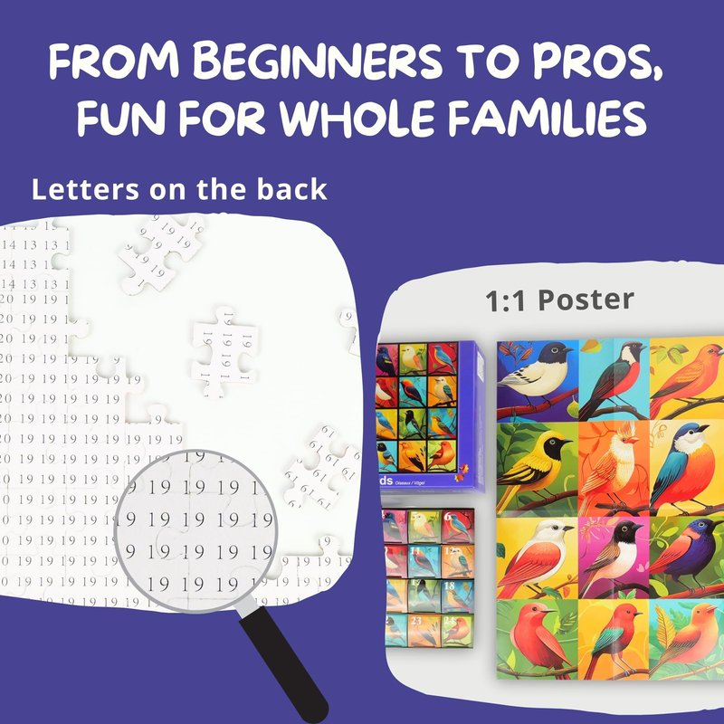 - 1:1 Poster and Letters on the back: Each puzzle includes a full-sized 1:1 reference poster and letters on the back of each piece, allowing you to visualize the completed image and choose your desired difficulty level for a tailored experience.