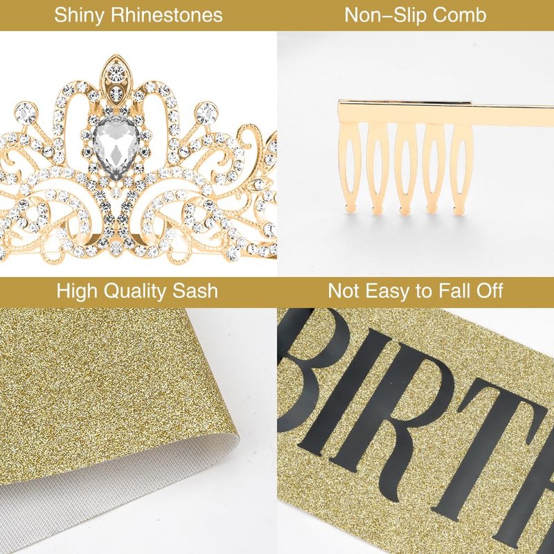 Birthday Crown for Girls Gold Tiara Sash Gifts for Womens Birthday Rhinestone Crystal Headband Princess Queen Crown Happy Birthday Decorations Birthday Gift Ideas Birthday Accessories Gifts for Women